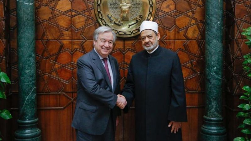 من جهة أخرى، أجرى غوتيريش مباحثات مع شيخ الجامع الأزهر أحمد الطيب في القاهرة، ثم ألقى غوتيريش كلمة انتقد فيها خطاب الكراهية المعادي للمسلمين، ومعاداة السامية والعنصرية والكراهية في جميع أنحاء العالم.