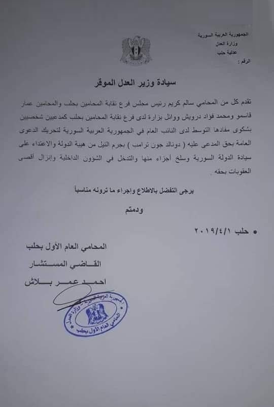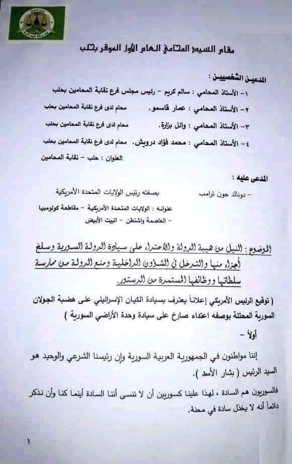 وطالبت الدعوى التي وجهها عدد من أعضاء نقابة المحامين في حلب، بينهم رئيس الفرع سالم كريم بـ "إنزال أقصى العقوبات بحق ترامب".