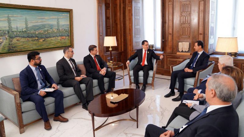 استقبل الرئيس السوري بشار الأسد، خورخيه أرياسا وزير السلطة الشعبية للعلاقات الخارجية الفنزويلي والوفد المرافق له، واكد ان سياسة بعض الدول الغربية، وعلى رأسها الولايات المتحدة، تجاه ما يحصل في فنزويلا، وفرض الحصار والعقوبات عليها، أصبح نهجاً تعتمده هذه الدول ضد كل من يتخذ مواقف لا تتوافق مع سياساتها.