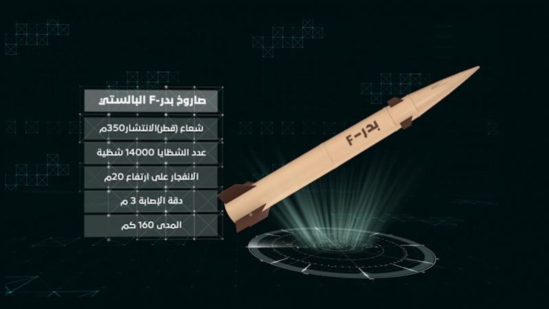 وأضاف أن عملية التطوير تمت في مركز الدراسات المتخصص بمجمع الشهيد أبو عقيل التابع لـ القوة الصاروخية مفيدا أن المنظومة دخلت الخدمة وتسلم مركز العمليات الصاروخية الدفعة الأولى من صاروخ بدرF الباليستي.