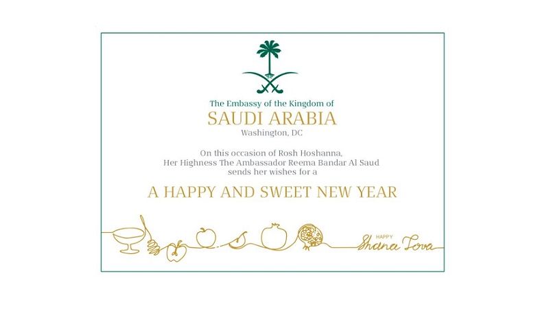 وتداول مراسل قناة "إن بي سي" الأمريكية، جوش ليدرمان، على حسابه في "تويتر"، صورة تظهر بطاقة تهنئة لليهود الأمريكيين بتوقيع سفيرة الرياض لدى الولايات المتحدة، الأميرة ريما بنت بندر بن سلطان آل سعود.