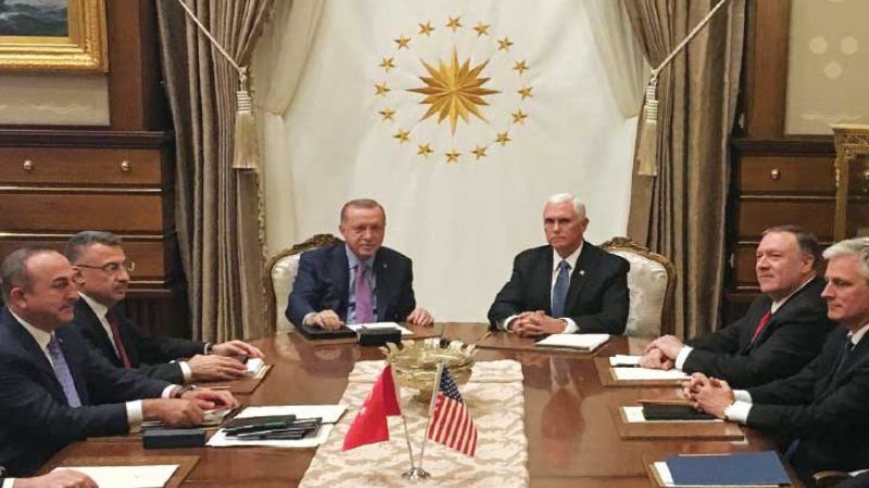 اتفقت الولايات المتحدة وتركيا، على تعليق العملية العسكرية التركية في شمال سوريا وفق ما أعلنه مايك بنس نائب الرئيس الأمريكي دونالد ترامب، بعد مباحثاته مع الرئيس التركي رجب طيب أردوغان في أنقرة.