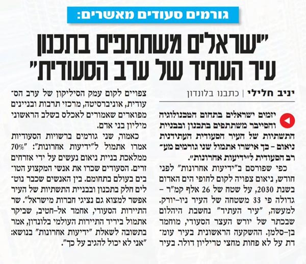 المصدران السعوديان قالا بالأمس للصحيفة إن "70% من عملية بناء "نيوم" تتم على أيدي مواطنين أجانب، وأضافا إن "السعوديين إستأجروا أفضل الأشخاص المهنيين في العالم في هذا المجال"، وأوضحا أن "من بين الذين الأشخاص الذين يشاركون في تخطيط وبناء البنى التحتية للمدينة يمكن إيجاد أيضاً ممثلي شركات من "إسرائيل"".