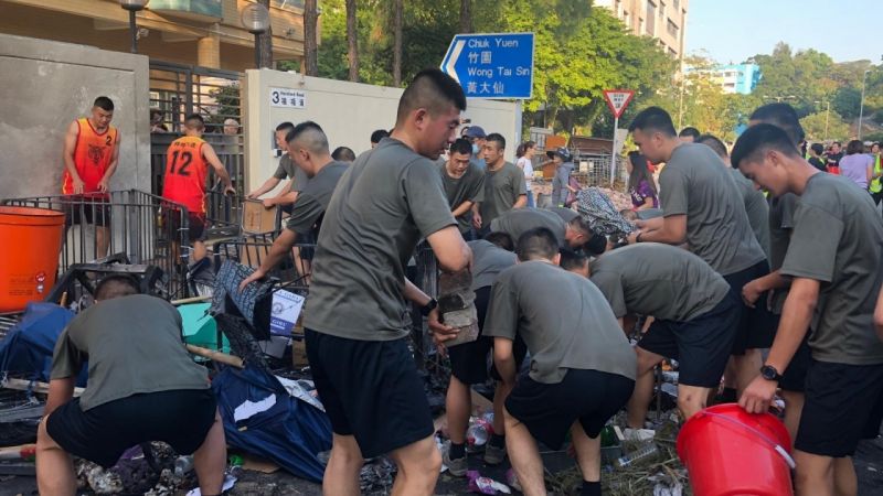 وأكدت شركة البث والإذاعة في هونغ كونغ اليوم السبت، أن العشرات من جنود جيش التحرير الشعبي الصيني، خرجوا دون أي إعلان رسمي من قبل الحكومة، إلى شوارع منطقة كولون تونغ، لإزالة المتاريس والأنقاض التي تركت هناك، بعد إغلاق المحتجين المعارضين لبعض الشوارع في وقت سابق من الأسبوع الجاري.