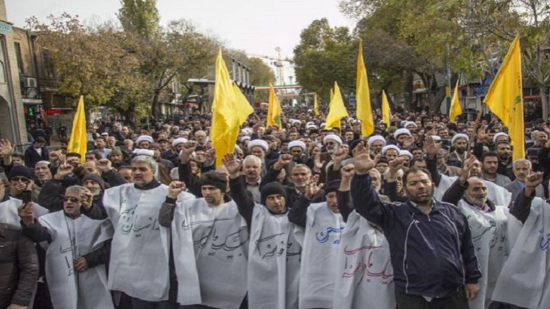 وارتدى المتظاهرون في مدينة ورامين جنوب العاصمة طهران الأكفان في إشارة إلى الجهوزية للتضحية بأرواحهم للحفاظ على الجمهورية الإسلامية والدفاع عنها حتى آخر قطرة دم في مواجهة المؤامرات والدسائس التي تُحاك ضدها.