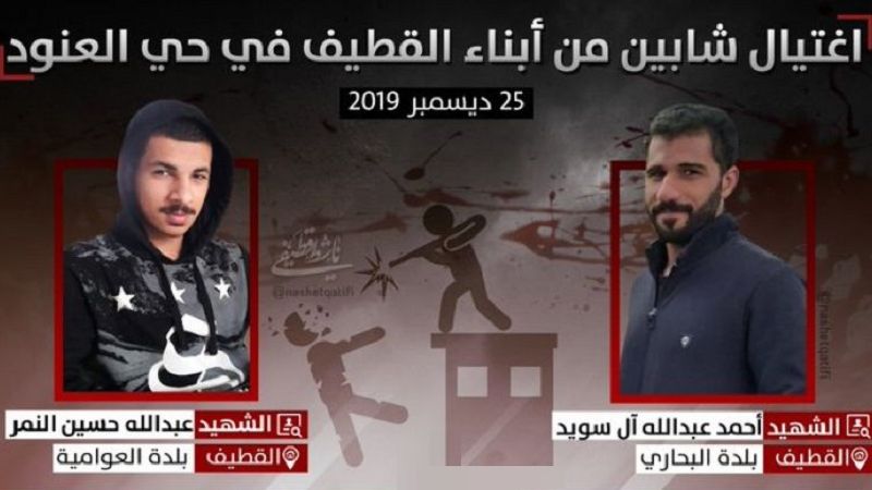 بعد عملية مُباغتة ووحشية شنّتها فرقتان من المباحث العامة وجهاز أمن الدولة في حيّ العنود في الدمام يوم الأربعاء الفائت (25 كانون الأول 2019) بحجّة البحث عن مطلوبين، نشر حساب "ناشط قطيفي" اسمَيْ الشابين أحمد آل سويد وعبد الله النمر اللذين استُشهدا في عملية التصفية الجسدية المتعمّدة في المنطقة أثناء وجودهما هناك لتصليح سيارتهما، فيما لم تُصدر السلطات حتى الآن بيانًا تعترف فيه بجريمتها.