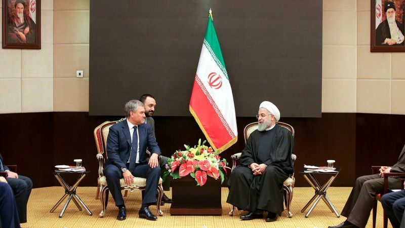 بحث رئيس مجلس الدوما (النواب) الروسي، فياتشيسلاف فولودين، مع الرئيس الإيراني، حسن روحاني، أثناء لقائهما في طهران، العلاقات بين البلدين، حسبما أورد مكتب الدوما الإعلامي.