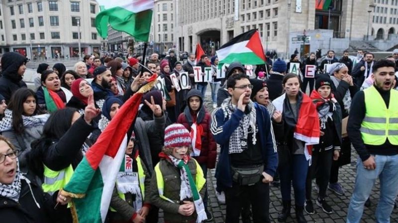 نددت تظاهرة في بروكسل قبالة السفارة الأمريكية، بخطة ترامب للتسوية المزعومة والمسماة "صفقة القرن"، والتي أعلنها الرئيس الأمريكي في البيت الأبيض قبل يومين.