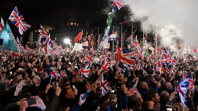 في الساعة 11 من ليل الجمعة في لندن لم تدق ساعة بيغ بن الشهيرة كونها تخضع للصيانة، لكن الآلاف من مؤيدي بريكست احتشدوا أمام مبنى البرلمان حيث احتفلوا على وقع التصفيق والنشيد الوطني بخروج بلادهم من الاتحاد الأوروبي.