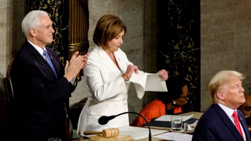 ويأتي هذا الموقف بين الرئيس الأمريكي دونالد ترامب وغريمته بيلوسي التي تقود الجهود الهادفة إلى عزله، بعد عام من مشهد تصفيقها الاستعراضي له خلال خطاب مماثل.