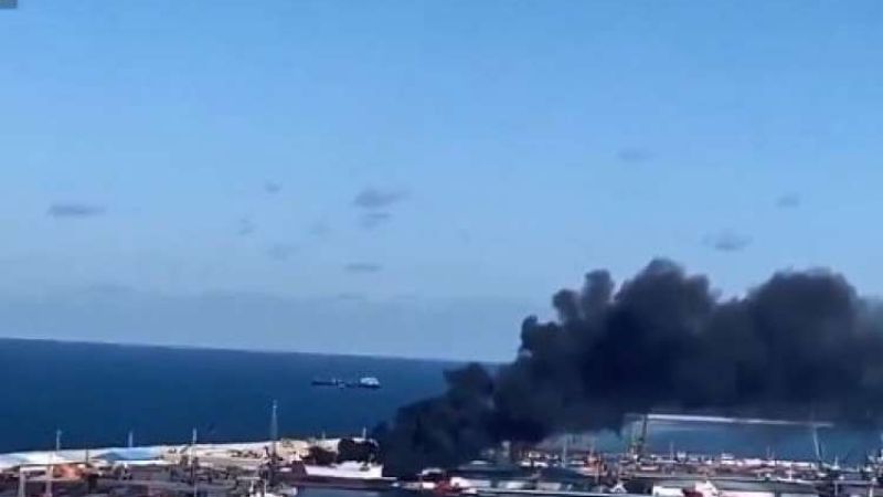 وأظهر مقطع مصور دخانا كثيفا يتصاعد من السفينة التي انتهكت الحظر الذي تفرضه الأمم المتحدة على إرسال الأسلحة إلى ليبيا، ونقلت المصادر في ميناء طرابلس إن مستودعا ضُرِب في الهجوم.