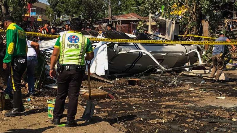 وقال اللفتنانت جنرال جيليرمو إليزار، إنه بعد إقلاع المروحية من مجمع للشرطة في مدينة سان بيدرو في مقاطعة لاغونا، حجب غبار كثيف رؤية الطيار، واصطدمت الطائرة بسلك كهرباء، مما تسبب في تحطمها.