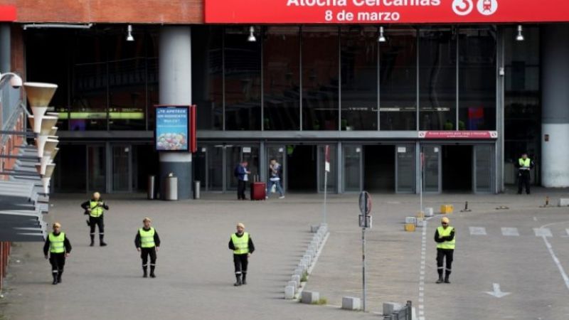 قام متخصصون عسكريون يرتدون سترات واقية بتعقيم محطات القطارات، بينما أمر أفراد الشرطة الذين كانوا يرتدون كمامات طبية المارة بالعودة إلى منازلهم بعد أن بدأت إسبانيا حملة للحد من انتشار فيروس كورونا بعدما زاد عدد الوفيات بسبب المرض.
