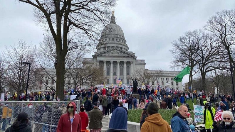 تجمع مئات المحتجين خارج مبنى الكونغرس في مدينة ماديسون بولاية ويسكونسن الأمريكية، لمطالبة حاكم الولاية، توني إيفرز، بإعادة فتحها رغم تزايد الإصابات الجديدة بفيروس كورونا أمس الجمعة.