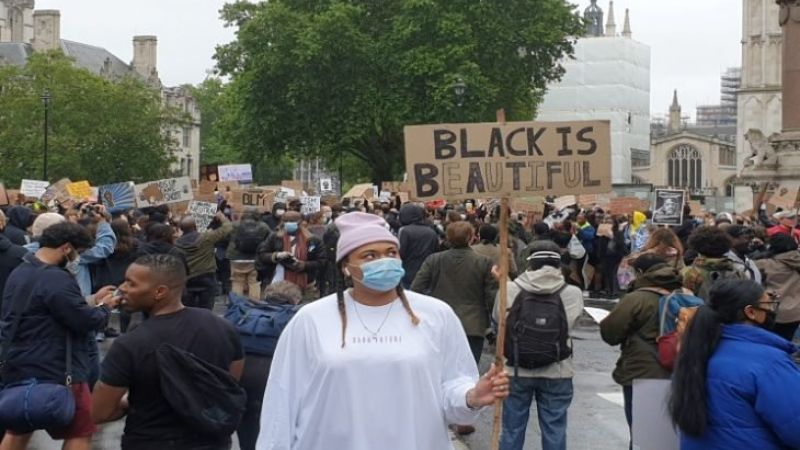 كما احتشد أيضا آلاف المحتجين في الميدان الواقع أمام البرلمان رافعين لافتات كتب عليها “حياة السود تهم” ومتجاهلين نصيحة الحكومة بتجنب التجمعات الضخمة بسبب خطر الإصابة بفيروس كورونا.