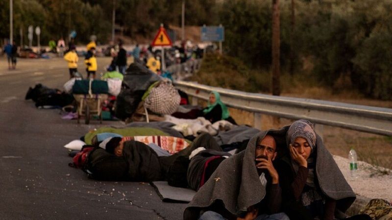 اضطر آلاف المهاجرين للنوم في العراء بجزيرة ليسبوس اليونانية بعد أن التهم حريق مخيم “موريا” وجعلهم دون مكان يلجأون إليه.