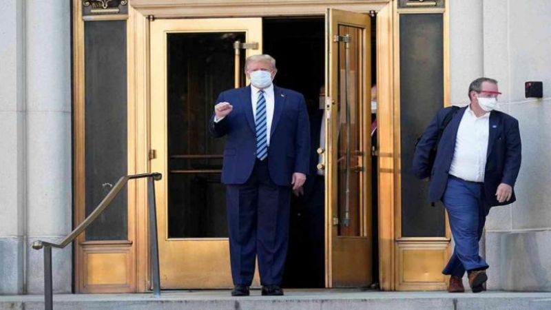 وعلى الرغم من أن أطباءه قالوا إنه لم يتجاوز بعد "مرحلة الخطر"، فقد ظهر ترامب متحديا بلا كمامة في مقطع مصور نشر بعد وقت قصير من عودته إلى البيت الأبيض من مركز "والتر ريد" الطبي.