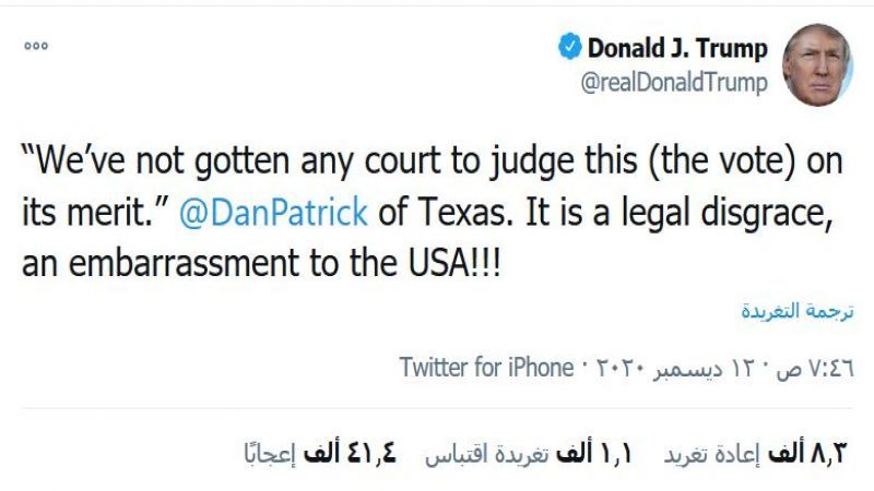 علّق الرئيس الأمريكي الخاسر، دونالد ترامب، على رفض المحكمة العليا الأميركية دعوى تقدمت بها ولاية تكساس للطعن بنتائج الانتخابات الرئاسية.