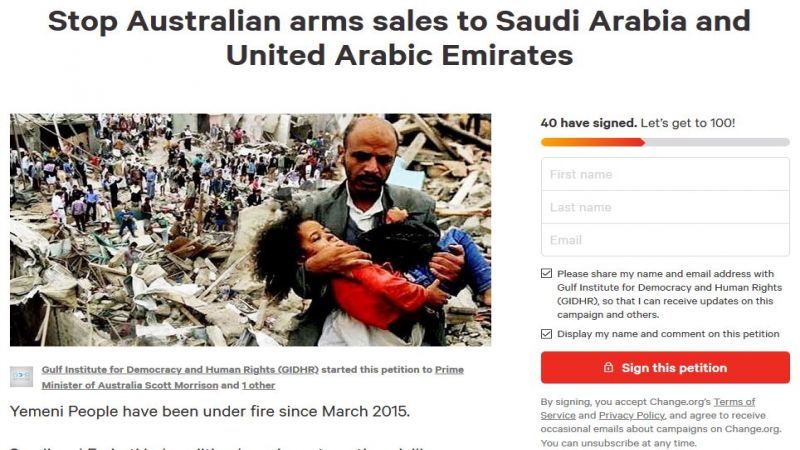 أطلق معهد الخليج للديمقراطية وحقوق الإنسان السبت عريضة لمطالبة الحكومة الأسترالية بإيقاف بيع الأسلحة لكل من السعودية والإمارات على خلفية استهداف المدنيين وجرائم الحرب المرتكبة في اليمن.