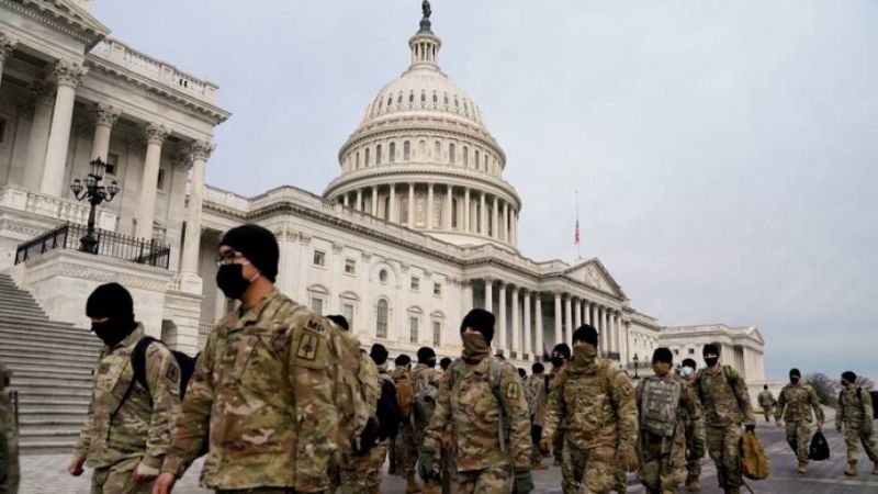 ولا يزال المبنى محاطا بسياج من شبكة سوداء من الصلب مع وجود حوالي 2250 جنديا مسلحين من الحرس الوطني لمقاطعة كولومبيا و18 ولاية، وهم من تبقوا من قوة أكبر بكثير تم وضعها بعد أن اقتحم أنصار الرئيس السابق دونالد ترامب المبنى عندما كان الكونغرس يصوت للمصادقة على فوز بايدن بالانتخابات، مما أدى إلى مقتل خمسة بينهم ضابط في شرطة الكابيتول وأصيب عشرات من رجال الشرطة في اشتباكات مع مثيري الشغب.