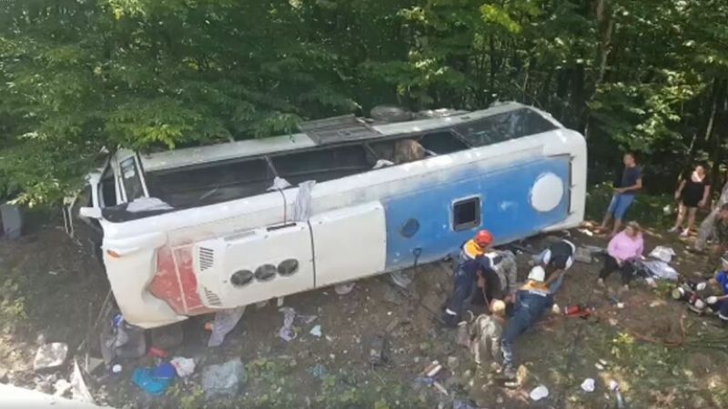 ويظهر التسجيل المصور أن حافلة الركاب السياحية انقلبت بعد سقوطها من طريقها إلى حفرة. وتتواجد في مكان الحادث سيارات الإسعاف والشرطة والعديد من شهود عيان.
