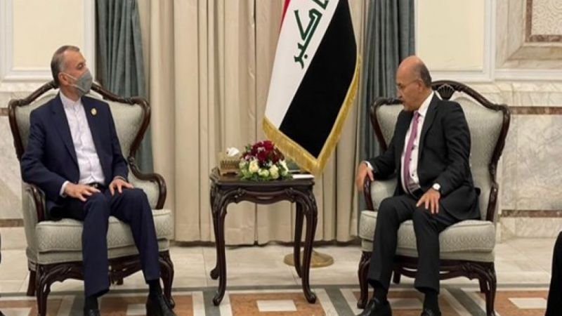 وقال مكتب صالح في بيان، ، إن الأخير "استقبل في قصر بغداد، وزير الخارجية الإيراني أمير عبد اللهيان، لبحث العلاقات الثنائية بين البلدين الجارين وأهميتها، وضرورة تعزيزها في مختلف المجالات، وتفعيل التفاهمات والاتفاقات المبرمة بين الجانبين في القطاعات الاقتصادية وتعزيز التبادل التجاري".