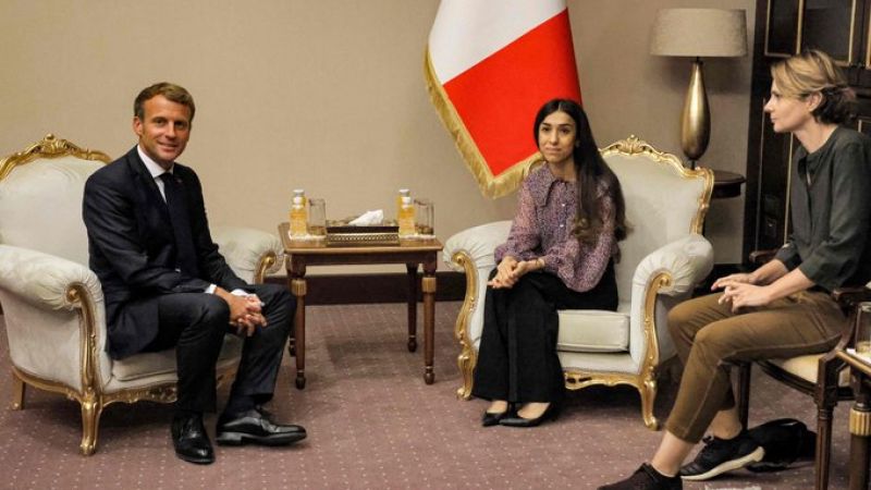 وقال موقع قناة "رووداو نيت" إن الرئيس الفرنسي التقى بالناشطة الإزيدية الحائزة على جائزة نوبل للسلام في بغداد.