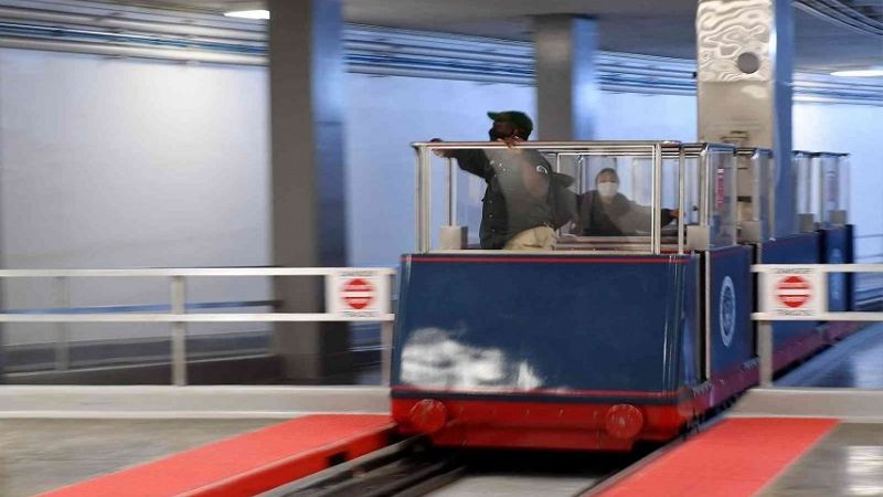 وتمتد سكك الحديد هذه لمسافة كيلومتر تقريباً، وتتيح الثواني الـ90 التي يستغرقها الانتقال من محطة إلى أخرى تحت أضواء النيون، وقتاً يكفي بالكاد للتحدث في المستجدات السياسية أو التداول بآخر الأخبار أو إطلاق العنان للخيال ولو لبرهة قصيرة.