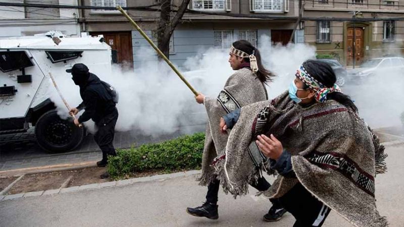 وفي وسط سانتياغو تظاهر نحو ألف ناشط من هنود المابوتشي ارتدى بعضهم الأزياء التقليدية من أجل المطالبة بالحكم الذاتي، قبل أن تتحرك الشرطة لتفريقهم مستخدمة خراطيم المياه والغاز المسيل للدموع. ورد المتظاهرون باستخدام الحجارة والعصي ضد رجال الشرطة في مواجهة استمرت نحو 40 دقيقة.