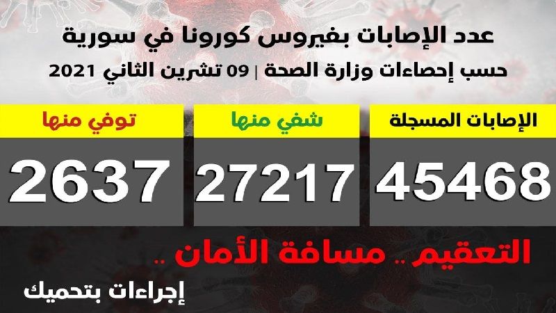 وأوضحت الوزارة أن عدد الإصابات المسجلة في سورية بلغ حتى الآن 45468 شفيت منها 27217 حالة وتوفيت 2637 حالة.