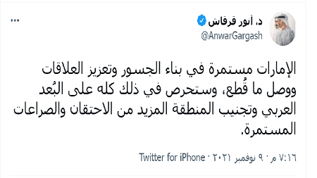 ولفت قرقاش في تغريدة على حسابه في "تويتر"، إلى أن هدف بلاده من مواصلة "بناء الجسور وتعزيز العلاقات ووصل ما قُطع"، يتمثل في الحرص "على البعد العربي وتجنيب المنطقة المزيد من الاحتقان والصراعات المستمرة".