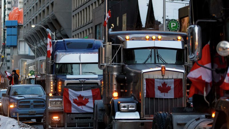 في أوتاوا، العاصمة الكندية، ما زالت القافلة التي سمت نفسها "قافلة الحرية"، والتي أطلقها سائقو الشاحنات المعارضون للتلقيح الإجباري لعبور الحدود، تحتل جزءًا من المدينة، ولا يزال هناك نقطتان للعبور عبر الحدود مغلقتين.