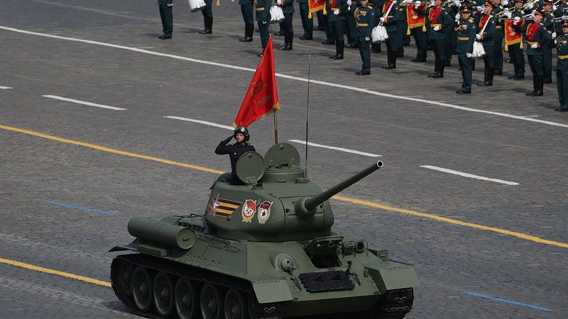 تتقدم دبابة "تي 34" السوفياتية المركبات في العرض العسكري الروسي وعلى متنها راية النصر السوفياتية خلال الحرب الوطنية العظمى.
