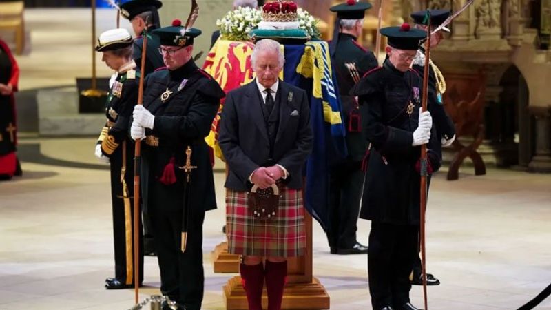 ارتدى ملك بريطانيا تشارلز الثالث تنورة قصيرة وجوارب حمراء خلال زيارته كاتدرائية "سانت غايلز" في العاصمة الاسكتلندية إدنبرة، لإلقاء نظرة على نعش الملكة الراحلة إليزابيث الثانية.
