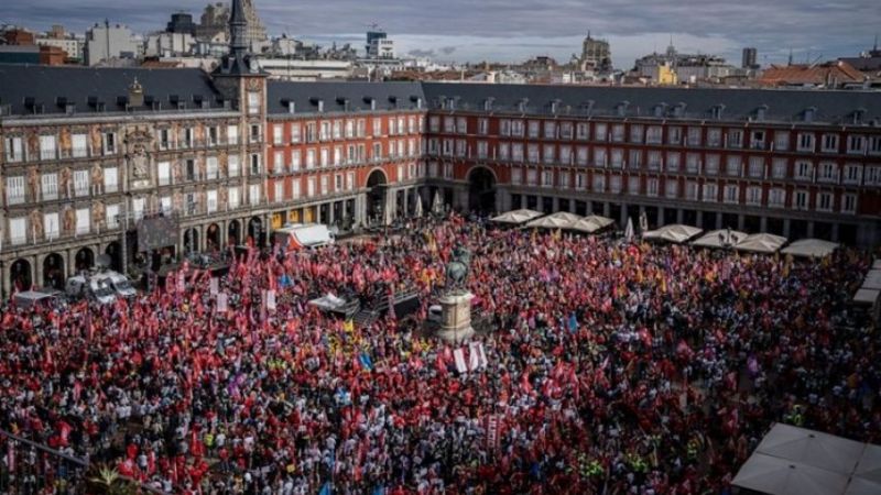 ولبّى 25000 محتج في مدريد نداء النقابتين، وتجمعوا في أماكن عدة في العاصمة قبل أن يتوجهوا ليلتقوا في “بلازا مايور” في قلب مدريد بجانب لافتة كبيرة كتب عليها “راتب أو صراع”.