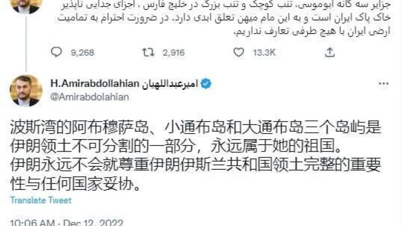 وقد كتب حسين أمير عبد اللهيان تغريدة على تويتر قبل يومين ردا على البيان المشترك للصين ومجلس التعاون فی الخليج الفارسي اكد فيها: تعتبر الجزر الإيرانية الثلاث، أبو موسى وتنب الكبرى وتنب الصغرى، جزء لا يتجزأ من أراضي جمهورية إيران الإسلامية وتنتمي إلى هذا الوطن الأم إلى الأبد. ولا نجامل مع احد