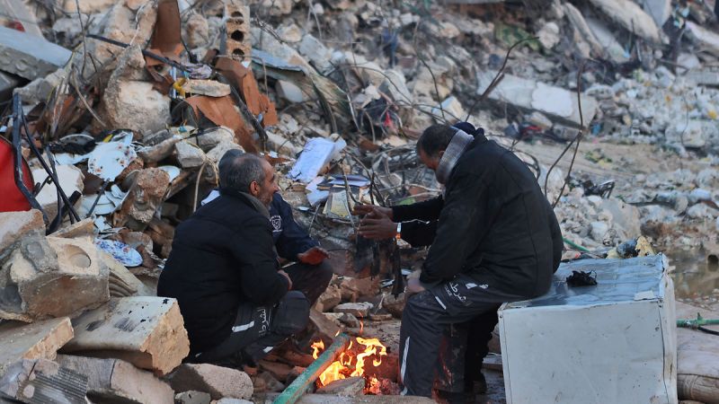 يستريحون صامتين بينما يحدّقون في الأنقاض، فيما ينتابهم مزيج من المشاعر، من إرهاق وألم وأمل.