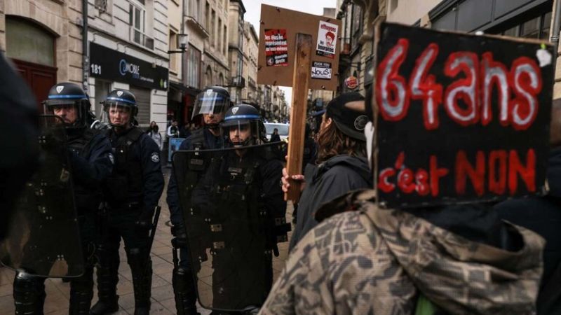 وقرر معارضو إصلاح نظام التقاعد التظاهر للتعبير عن غضبهم وسط مطالبات باستقالة الرئيس إيمانويل ماكرون. وأطلق المتظاهرون الألعاب النارية باتجاه قوات الأمن التي استخدمت الغاز المسيل للدموع لتفريق المحتجين.