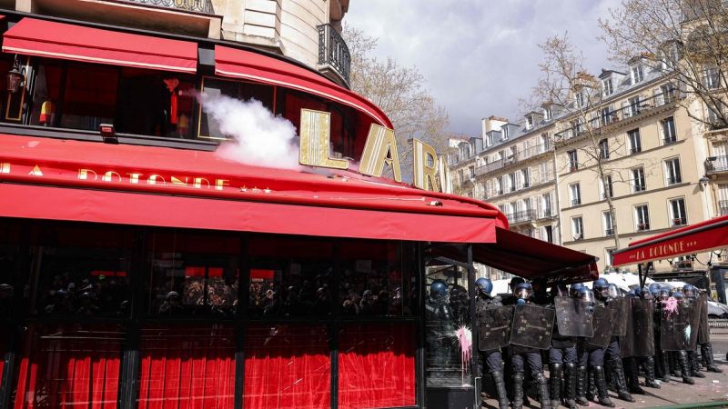 وضربت شرطة مكافحة الشغب طوقا حول المطعم لحمايته في اليوم ال11 للاحتجاجات والإضرابات الوطنية ضد مشروع ماكرون رفع سن التقاعد من 62 إلى 64 عاما.