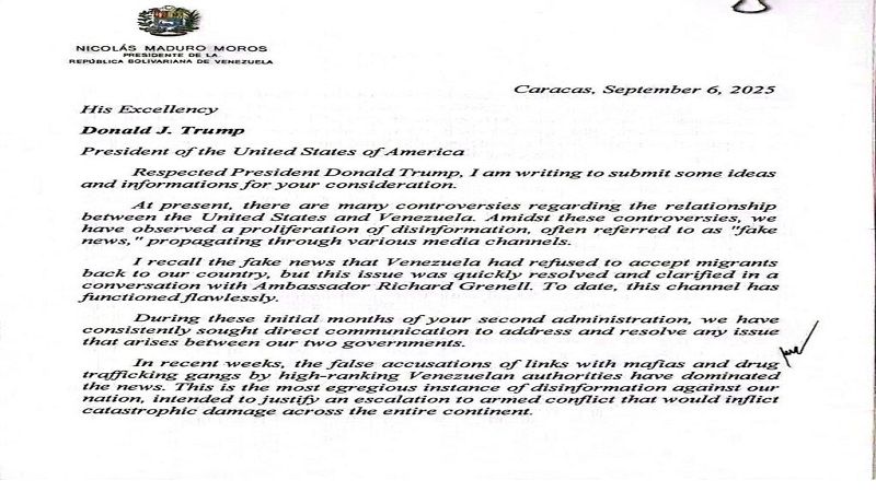نشرت فنزويلا نص رسالة بعثها الرئيس الفنزويلي، نيكولاس مادورو، إلى نظيره الأميركي، دونالد ترامب، في الـ5 من أيلول/سبتمبر الحالي، يدعوه فيها إلى تعزيز السلام عبر الحوار.