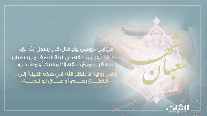 عن أبي موسى الأشعري رضي الله عنه أن رسول الله ﷺ قال: ((إن الله ليطلع في ليلة النصف من شعبان فيغفر لجميع خلقه، إلا لمشرك أو مشاحن)) رواه ابن ماجه والطبراني، وحسّنه وصححه جمع من أهل العلم بمجموع طرقه.